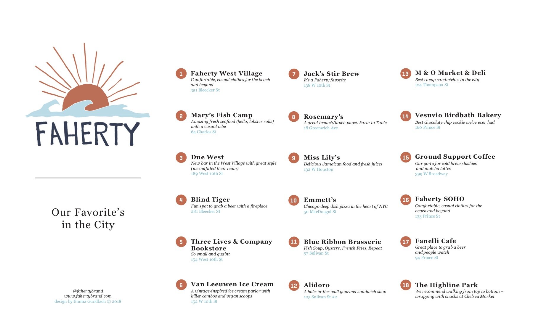 In collaboration with wildsam the Nantucket guide and map was created and illustrated by Emma for Faherty’s local shop. They wanted the guide to welcome guests and pass on secrets of their favorite local jaunts, bites and experiences on the island. Following the project, Faherty brought on Emma to create two branded pieces in the map guide format for their New York City and Sag Harbor shops.