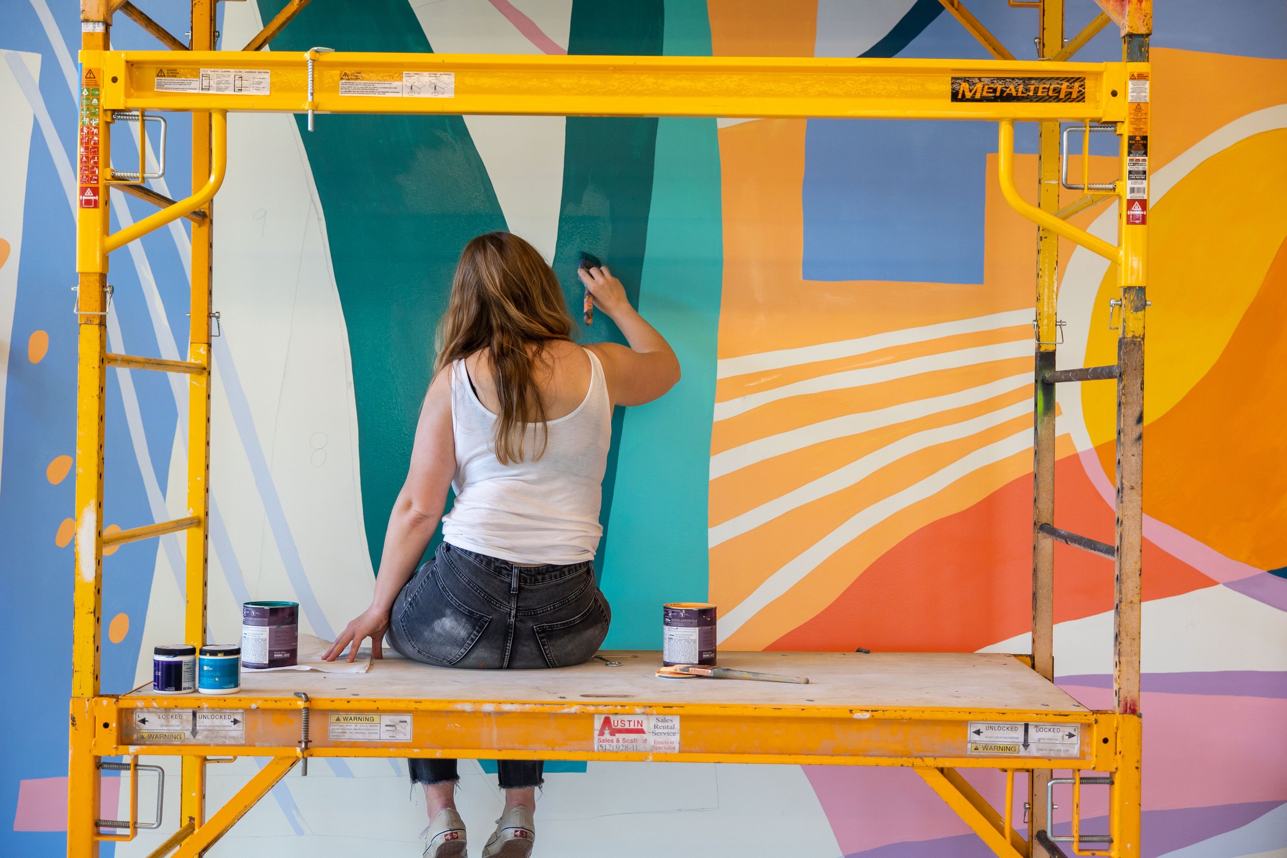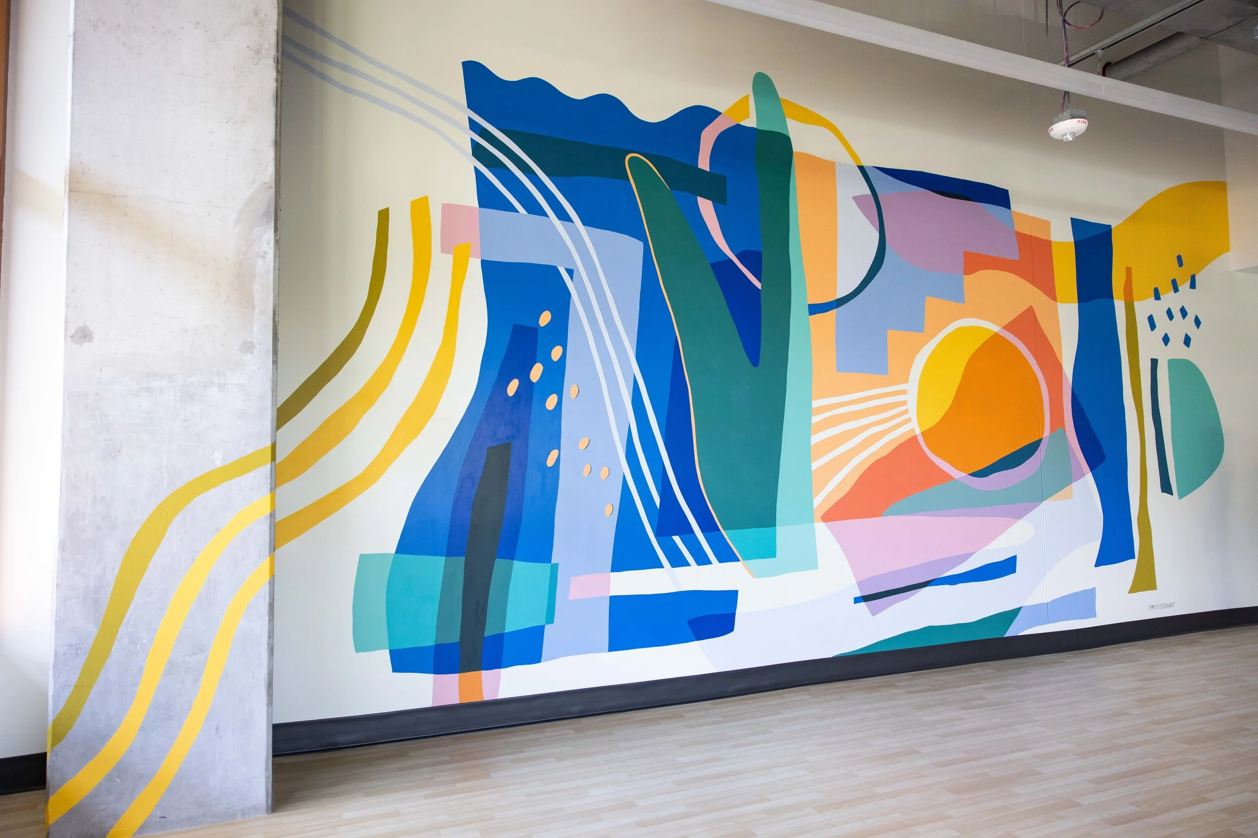 Overlooking Shoal Creek and shaded by its diverse canopy, Emma project managed and painted this bright mural in a tech company’s employee fitness room. With dynamic artwork designed by Emily Eisenhart, Emma brought the mural to life painting alongside a local team of talented painters.